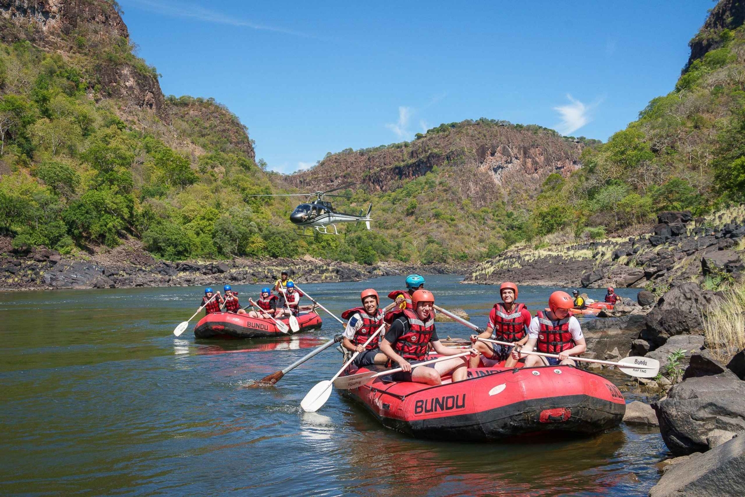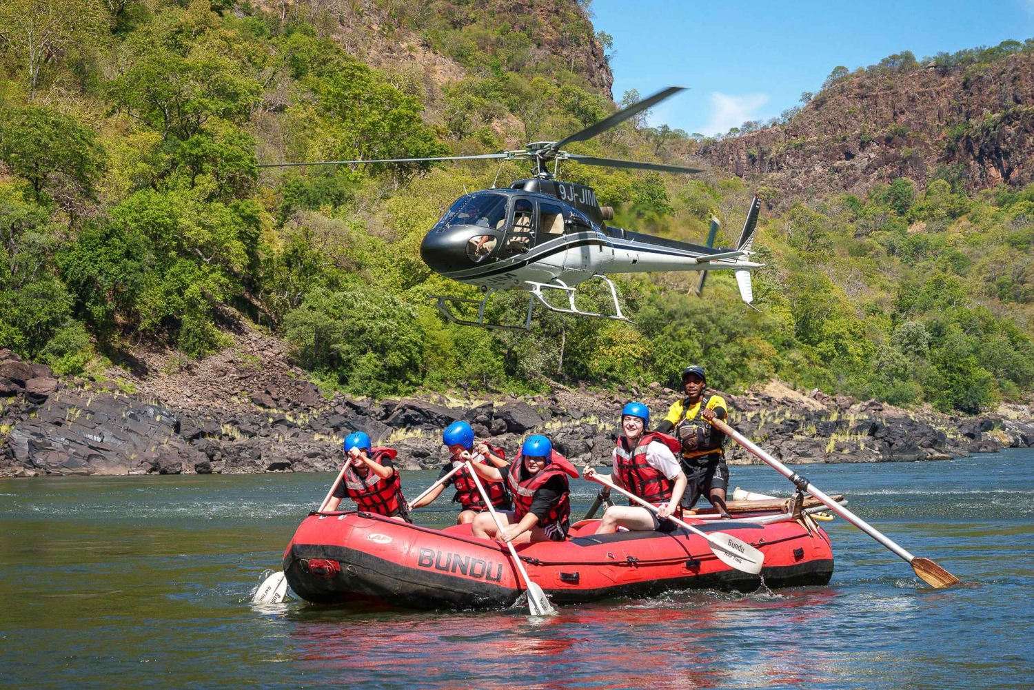 Experience the best of Zambezi adventure. A thrilling half-day white-water rafting trip through the Batoka Gorge followed by a helicopter lift-out from Rapid #10. After pickup from your Livingstone accommodation, our experienced guides deliver a safety briefing and equip you with helmet and lifejacket. You’ll raft a series of class III–IV rapids, enjoy riverside snacks, then finish at Rapid #10 where a helicopter will lift you out of the gorge and give you spectacular aerial views (including a flight path over Victoria Falls) back toward Batoka Sky / Maramba Aerodrome. A transfer from the aerodrome back to Livingstone accommodation or the border is included. Minimum age and weight restrictions apply. Booking includes guides, safety gear and transfers.Includes