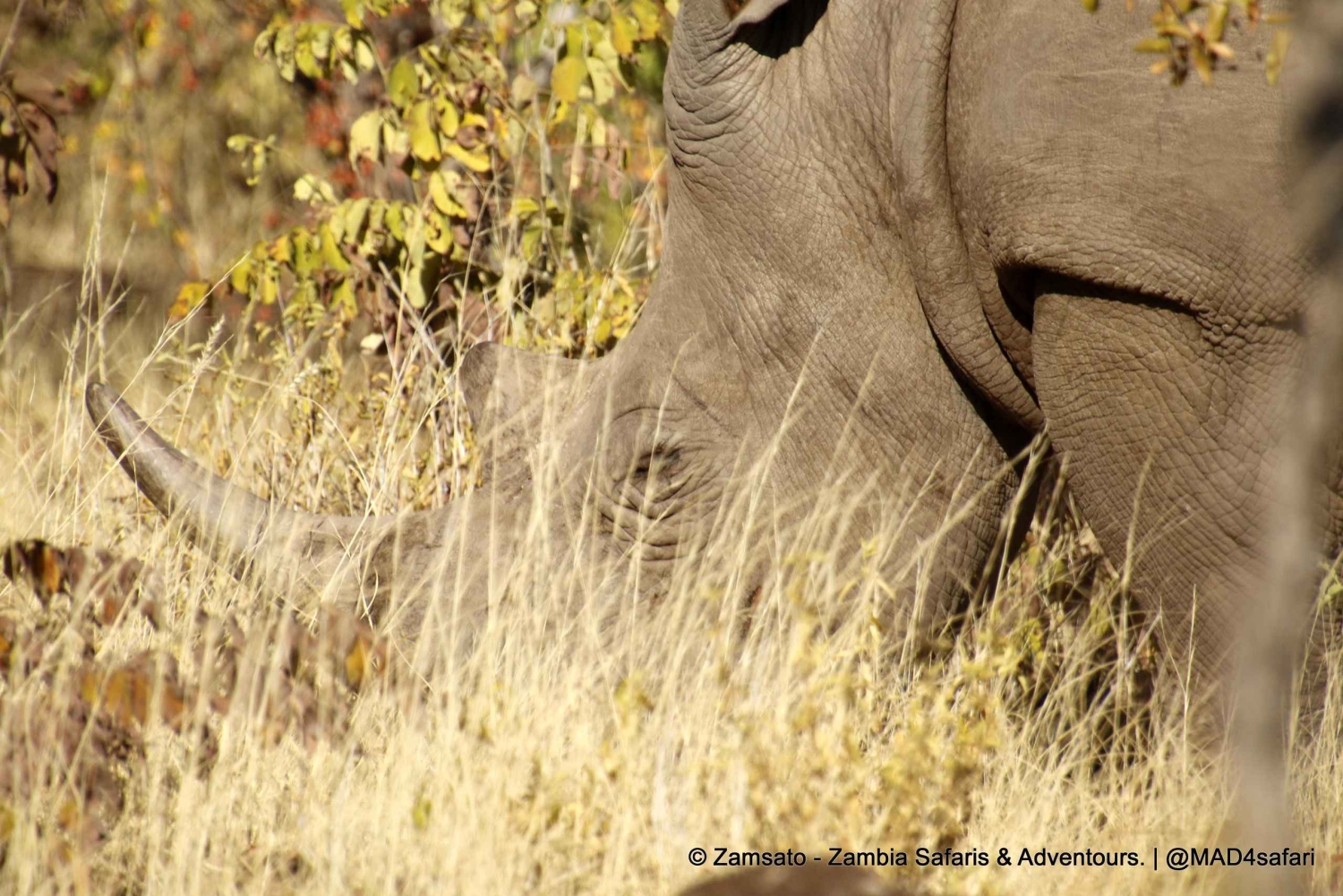 - The tour starts at around 06:00hrs and takes approx. 3-4 hours. You are escorted by a professional guide and an armed DNPW escort ranger. We focus on tracking White or Square-lipped Rhinos which are resident in Mosi-oa-Tunya National Park. We are very fortunate to have a herd of 10 White Rhinos which is under constant surveillance to prevent them from being poached. While moving through the bush we identify tracks, plants, birds and their calls. We might come across other animal species like Zebras, Wildebeest, Warthog, Impala, Baboons, etc. This activity can be combined with our Tour of the Victoria Falls and it is part of the 1-Day Highlights around the Victoria Falls.