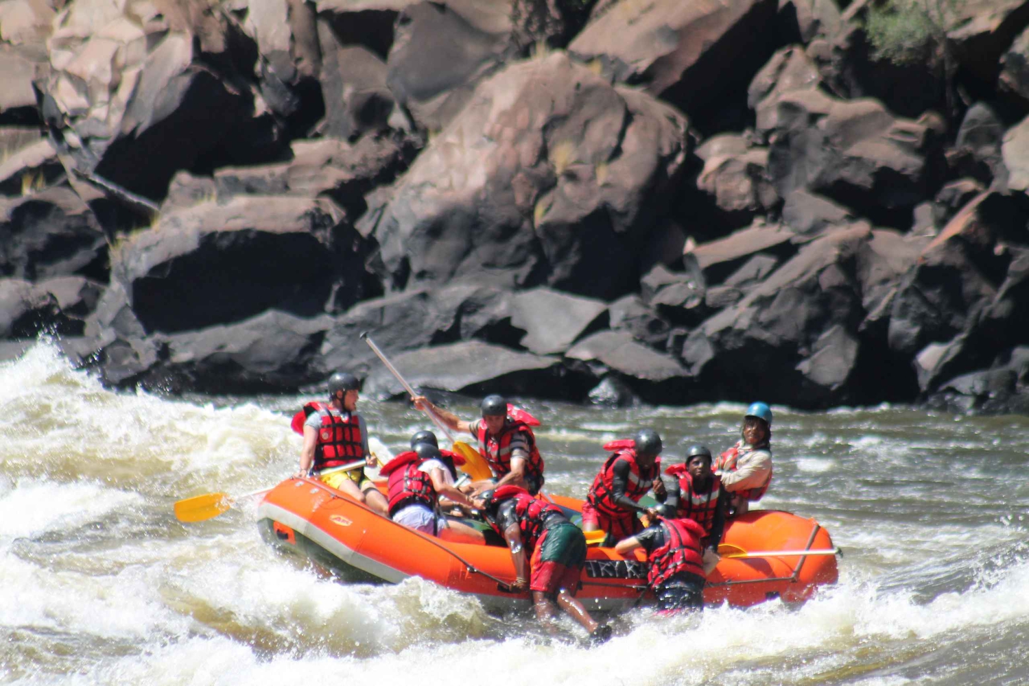 A full-day rafting trip on the Zambezi River in Victoria Falls, Zimbabwe, promises an adventure-filled day in one of nature's most awe-inspiring settings. Brace yourself for an adrenaline rush as you conquer challenging rapids, surrounded by breathtaking gorges and landscapes. Afterward, enjoy a well-deserved lunch at a local establishment. After rafting its off to our rafting village to Freshen up and enjoy a traditional dinner overlooking the Batoka Gorge and Zambezi River. This unforgettable experience seamlessly combines excitement, natural wonders, and peaceful moments, leaving you with lasting memories of your time in Zimbabwe. Considered the best one-day rafting experience in the world, the Zambezi River flows down the Batoka Gorge and provides one of the most beautiful rafting trips imaginable. Its white-water rapids and striking scenery, deep within the sheer black cliffs of the Batoka Gorge afford the adrenaline junkie a wild roller-coaster ride along a route carved over millions of years by the middle Zambezi River. Our guides are born and raised Zimbabweans who have been have rafting the Mighty Zambezi since they were 14 years old. The passion, experience and culture of our rafting team is second to none. All guides are fully trained professionalsIncludes