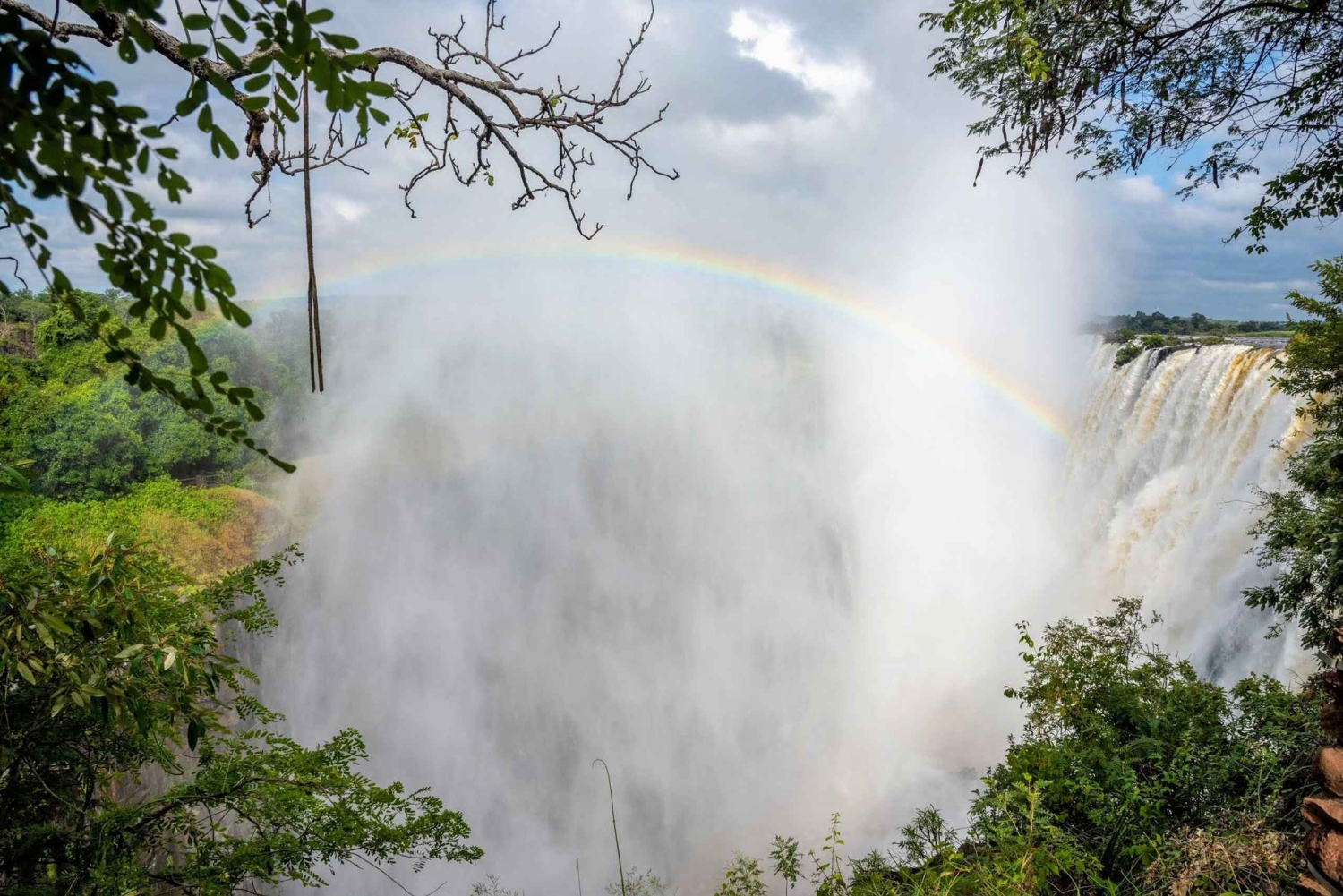 Ontdek de grootsheid van de Victoria-watervallen, een van de zeven natuurlijke wereldwonderen en de meest spectaculaire waterval van Afrika. Lokaal bekend als 'Mosi-oa-Tunya', de rook die donderd, bieden de watervallen een onvergetelijke mix van kracht, schoonheid en adembenemende landschappen. Je rondleiding voert je langs regenwoudpaden die naar meerdere uitzichtpunten leiden, elk met een uniek perspectief op de machtige Zambezi-rivier terwijl deze in de Batoka-kloof stort. Voel de koele nevel op je huid, bewonder de levendige regenbogen die zich boven de spray vormen en luister naar het donderende gebrul dat door de kloof weerklinkt. Onderweg deelt je gids inzichten over de geologie, de wilde dieren en de rijke culturele geschiedenis van het gebied. Geniet van fotomogelijkheden op iconische plekken zoals de Devil's Cataract, Main Falls, Horseshoe Falls en de Rainbow Bridge. Deze ervaring is perfect voor natuurliefhebbers, fotografen, avonturiers en iedereen die een van de meest ontzagwekkende bezienswaardigheden op aarde wil zien. Victoria Falls is niet alleen een uitzicht, het is een gevoel, een moment en een herinnering die je voor altijd zult koesteren.Includes